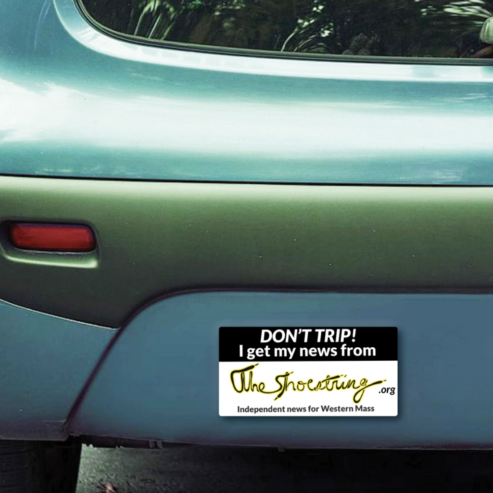 WHETHER IT'S A QUICK TRIP to the grocery store and library or a road trip across the country, show your support for independent local news in Western Mass wherever your travels take you with the official Shoestring bumper sticker.