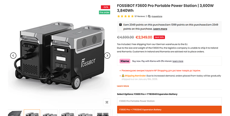 Our best option for surviving the winter is to purchase a charging station with an additional battery to maintain heating, hot water, and basic energy needs during outages. I carefully selected a model and settled on the FOSSiBOT F3600 Pro with an additional FOSSiBOT FB3840 battery. There's a significant shortage of charging stations in Ukraine right now, so we have to order them from Europe. The cost of the station, battery, and delivery is around €2,500. This is an unaffordable amount for our family.
